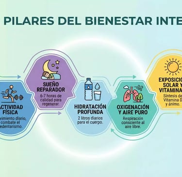 Dormir no es "perder el tiempo". Es el momento en el que tu cuerpo realiza las tareas de mantenimiento más críticas: regeneración de tejidos, limpieza de toxinas cerebrales y equilibrio del sistema inmunitario. Menos de 6-7 horas de sueño de calidad es una invitación abierta a la inflamación crónica.